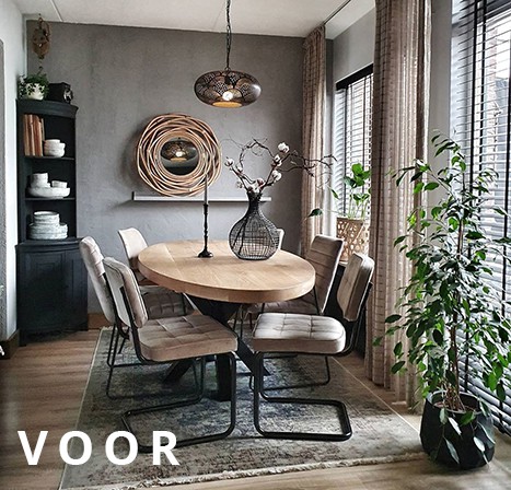 De keus voor ‘June’ bleek een hele goede. Het resultaat mag er namelijk zeker zijn! De woonkamer oogt nu een stuk rustiger. Bovendien lijkt de ruimte een stuk groter. In plaats van te clashen, complimenteren de verschillende soorten raamdecoratie elkaar nu. De houten jaloezieën geven de kamer een stoere uitstraling. De gordijnen zorgen ervoor dat het geheel tevens warm en sfeervol aandoet. Dat warme gevoel komt voornamelijk door de linnen structuur. Linnen (look) gordijnen zijn onwijs populair. Niet gek, want de natuurlijke stof creëert meteen een gevoel van ‘thuis’. Madeleine: “De stof June is prachtig. De twee kleuren garens zorgen voor een levendig effect.” Deze stof is kamerhoog waardoor er geen naden zichtbaar zijn. Aan de onderzijde van de stof is een verzwaringskoord gemaakt, zodat deze prachtig valt en er geen zoom in hoeft. Absoluut een pareltje uit de collectie!