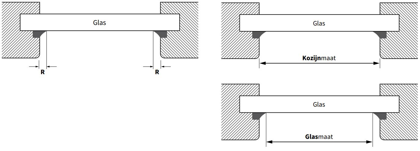 Om de juiste bestelmaten te bepalen, dien je rekening te houden met de afmeting van het raamrubber (R). De afmeting R bepaalt of je de kozijnmaat of de glasmaat moet meten.